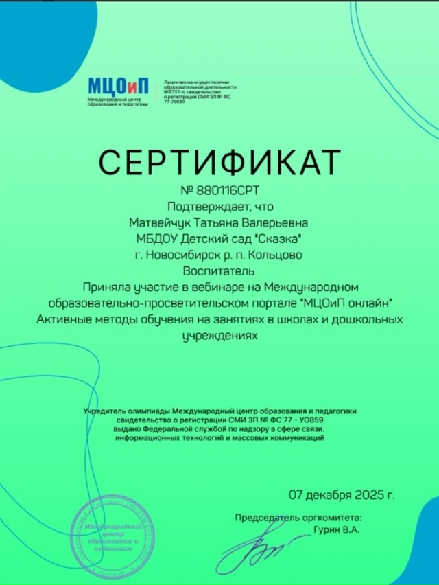 Сертификат 2025 Вебинар "Активные методы обучения на занятиях в школах и дошкольных учреждениях "
